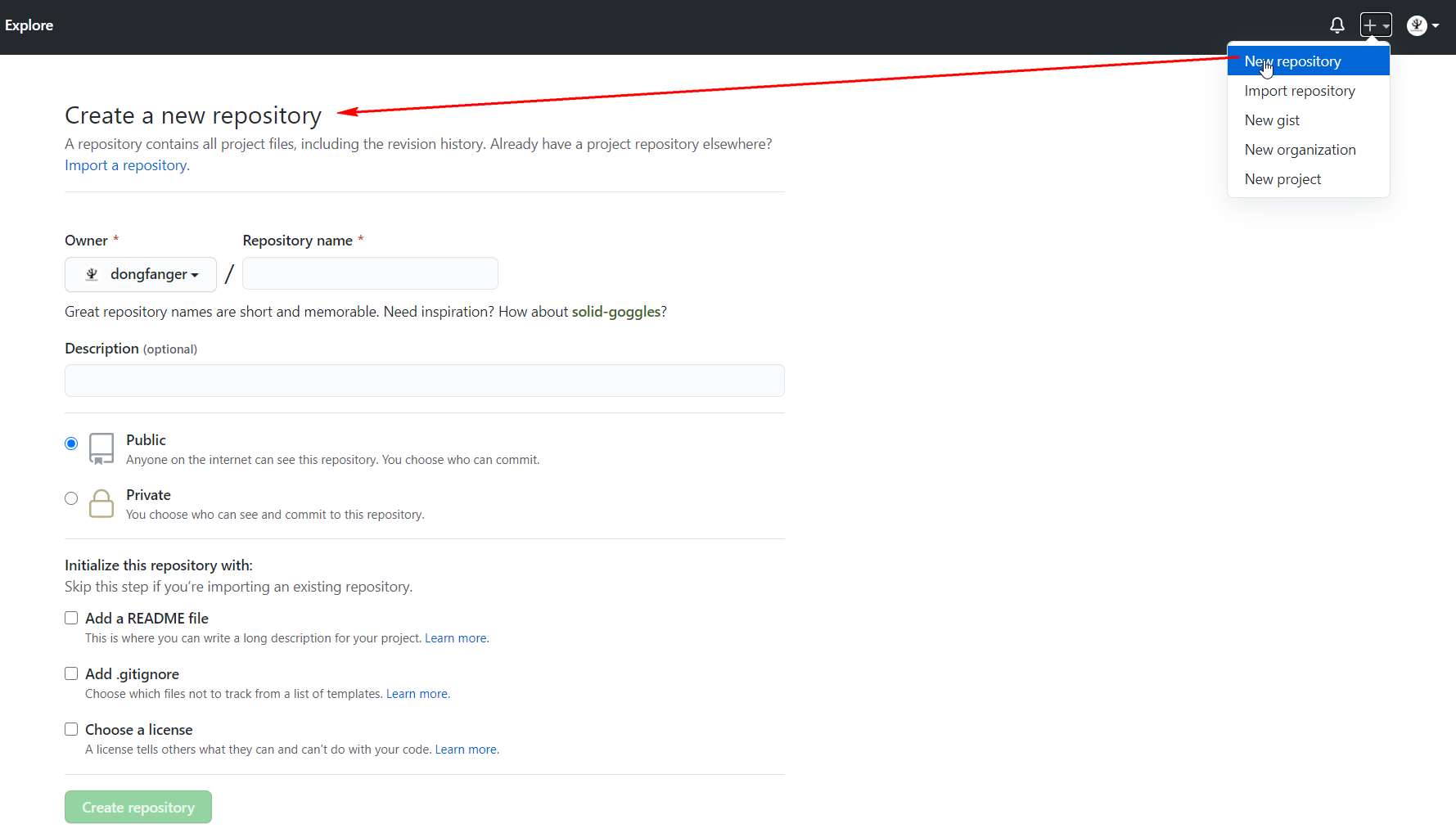 第一步先在 GitHub 上创建仓库,需要填写仓库名,公开/私有等