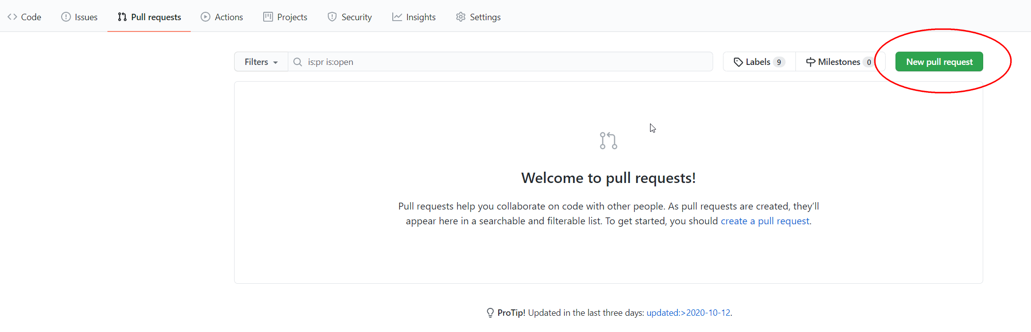 打开代码仓库后,切换到Pull requests 标签页,创建新的 pull request 请求