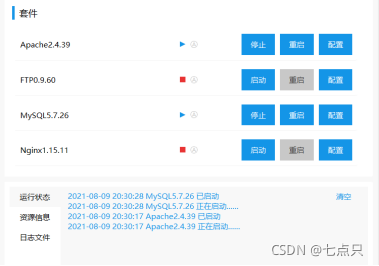 启动之后在首页哪里点击启动APache和mysql,当看到下面运行运行状态显示已启动就表示启动完毕了