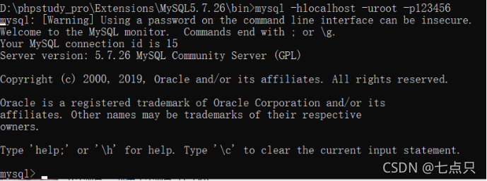 在phpstudy启动后点击数据库-修改root密码,在设置完密码之后来到cmd,切换到MySQL所在的目录下(如果找不到目录在哪的可以打开phpstudy点击设置-MySQL,选择版本),输入mysql -uroot -p(加密码),启动MySQL管理界面