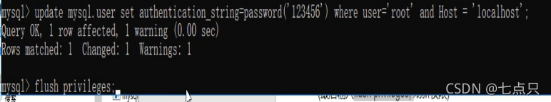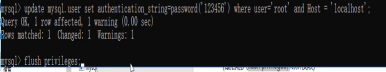 update user set authentication_string=password(‘密码’) where user=’root’ and Host =’localhost’;