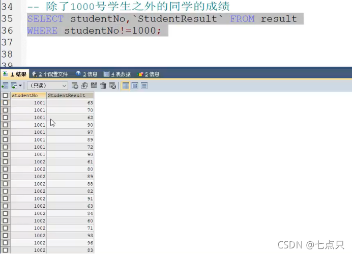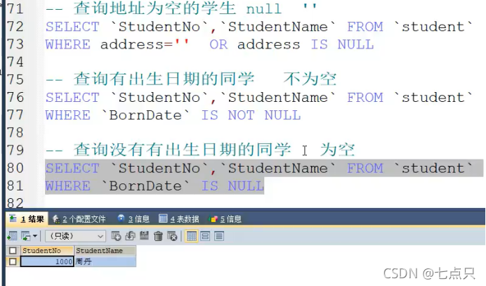 SELECT COUNT (1) FROM result;-- Count (1),不会忽略忽略所有的 null值本质计算行数(3)