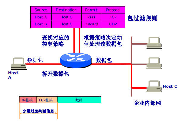 - 过滤的规则根据防火墙内部设置的过滤规则表,只有满足过滤规则的数据包才能转发至相应的目的地址,其余的数据包则会被丢弃。