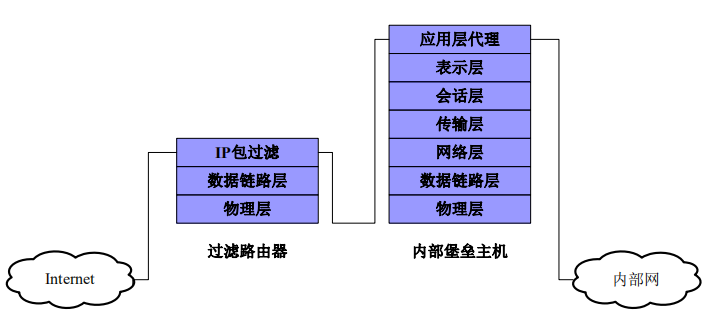 - 堡垒主机在应用层对客户请求进行判断,允许或者禁止某种服务,如果请求被允许,则将数据包转发,否则就丢弃数据包。