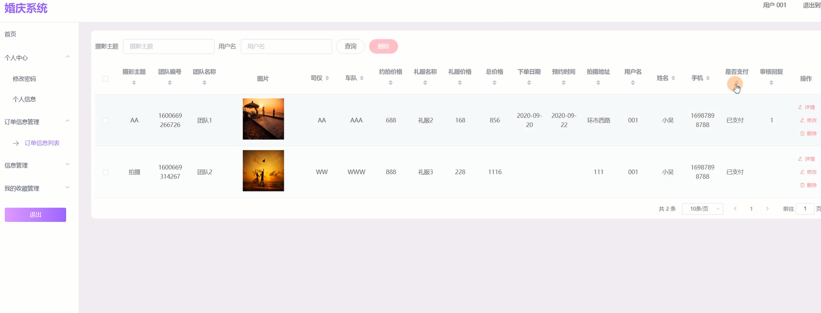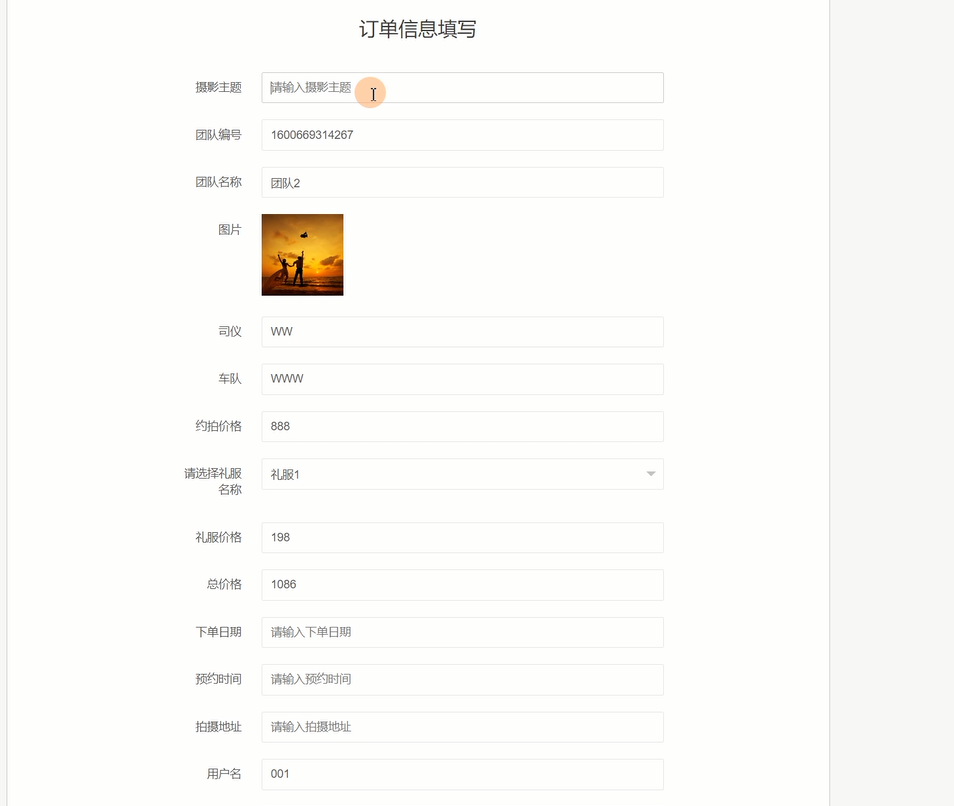 商家功能,管理订单,将外出工作的工作人员设置外出(司仪,摄影团队,车队),其他服务如果已经使用则设置为使用中(礼服,影楼,婚庆场地),以及使用实时通讯,与客户交流。设置时间安排提醒通过邮件发送给消费者。