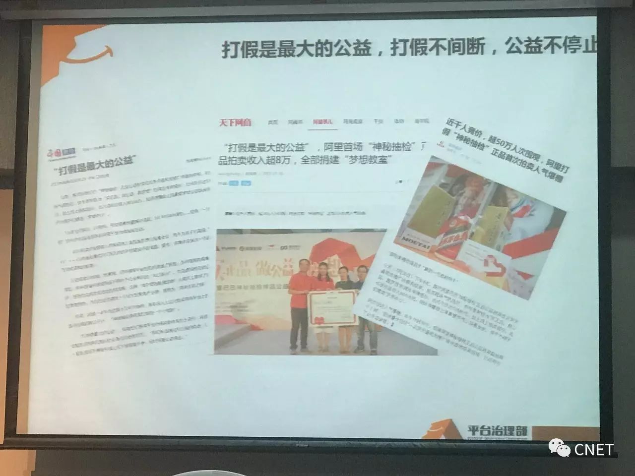 呼吁“像治理酒驾一样打假”的阿里巴巴董事局主席马云曾在2016年平台治理誓师大会上放出豪言:阿里打假“预算无上限,进人无上限”!此话一出,阿里上下更忙乎了,比如一年花1亿买假验假、花20万维护一间“阿里打假证物仓”、神秘抽检覆盖23%天猫商家、大数据打假,还有打假特战队上阵,实现了在2016年向警方提供打假线索1184条,协助警方抓获犯罪嫌疑人880名,捣鼓涉假窝点1419个,破获案件涉案金额超过30亿元的成绩,是前年的两倍。