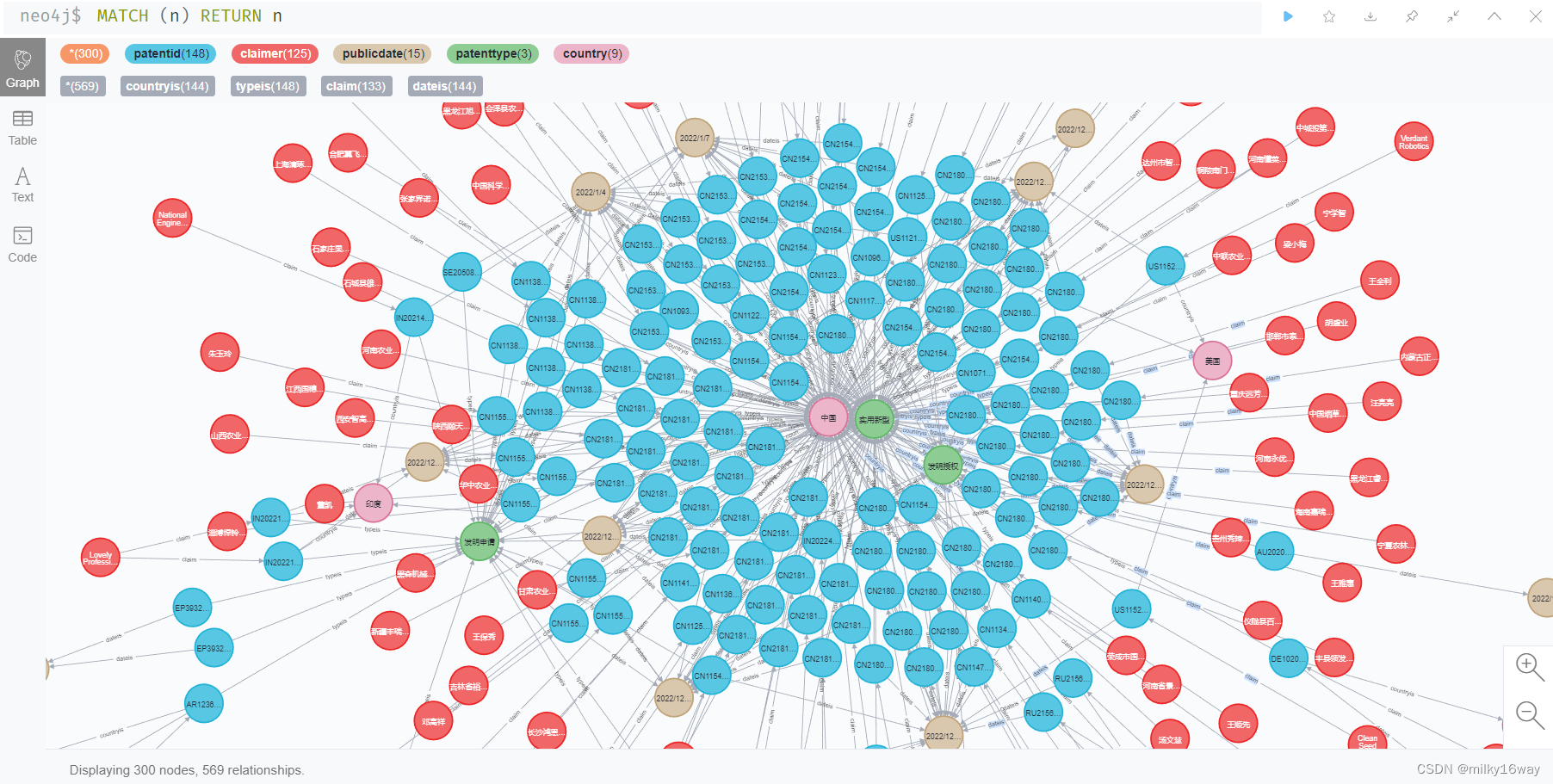 import csvpatentgraph = Graph("http://localhost:7474", auth=("neo4j", "neo4j"))with open('fertilizermachine.csv') as csvfile:reader = csv.DictReader(csvfile)for row in reader:#create entitiespatentid = Node("patentid", name=row["公开(公告)号"])patentid['title'] = row["标题 (中文)"]#create attributespatentgraph.create(patentid)claimer = patentgraph.nodes.match("claimer", name=row["申请人"]).first()if not claimer:claimer = Node("claimer", name=row["申请人"])patentgraph.create(claimer)publicdate = patentgraph.nodes.match("publicdate", name=row["公开(公告)日"]).first()if not publicdate:publicdate = Node("publicdate", name=row["公开(公告)日"])patentgraph.create(publicdate)patenttype = patentgraph.nodes.match("patenttype", name=row["专利类型"]).first()if not patenttype:patenttype = Node("patenttype", name=row["专利类型"])patentgraph.create(patenttype)country = patentgraph.nodes.match("country", name=row["公开国别"]).first()if not country:country = Node("country", name=row["公开国别"])patentgraph.create(country)#create relationshipsclaim = Relationship(claimer, "claim", patentid)dateis = Relationship(patentid, "dateis", publicdate)typeis = Relationship(patentid, "typeis", patenttype)countryis = Relationship(patentid, "countryis", country)A = Subgraph(relationships=[claim, dateis, typeis, countryis])patentgraph.create(A)print(row)