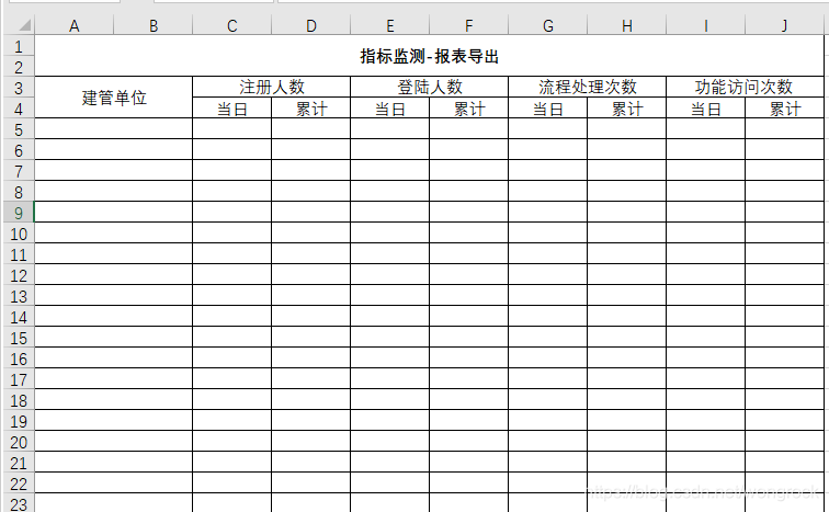 /*** 指标监测导出封装方法* * @param sheet* @param resutList* 数据集合* @param rownum* excel行数* @param index* 集合索引 从0开始*/public void writeExcel(XSSFSheet sheet, List resutList, Integer rownum, Integer index) {if (resutList.get(index) != null && !"".equals(resutList.get(index))) {Row row = sheet.getRow(rownum);String proName = resutList.get(index).getProName();Cell cell = row.getCell(0);cell.setCellValue(proName);String regDayNum = resutList.get(index).getRegDayNum();// 注册人数当日cell = row.getCell(2);cell.setCellValue(regDayNum);String regNum = resutList.get(index).getRegNum();// 注册人数累计cell = row.getCell(3);cell.setCellValue(regNum);String loginDayNum = resutList.get(index).getLoginDayNum();// 登录人数当日cell = row.getCell(4);cell.setCellValue(loginDayNum);String loginNum = resutList.get(index).getLoginNum();// 登陆人数累计cell = row.getCell(5);cell.setCellValue(loginNum);String flowDayNum = resutList.get(index).getFlowDayNum();// 流程当日cell = row.getCell(6);cell.setCellValue(flowDayNum);String flowNum = resutList.get(index).getFlowNum();// 流程累计cell = row.getCell(7);cell.setCellValue(flowNum);String menuDayNum = resutList.get(index).getMenuDayNum();// 功能当日cell = row.getCell(8);cell.setCellValue(menuDayNum);String menuNum = resutList.get(index).getMenuNum();// 功能累计cell = row.getCell(9);cell.setCellValue(menuNum);}}//数据格式如下