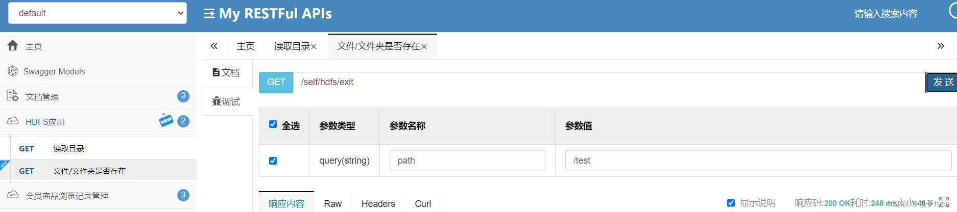 public class HDFSController {@Autowiredprivate HDFSService hdfsService;@GetMapping("/exit")@ApiOperation(value = "文件/文件夹是否存在")public CommonResult exit(String path){boolean b = hdfsService.existFile(path);return CommonResult.success(b);}@GetMapping("/catalog")@ApiOperation(value = "读取目录")public CommonResult readCatalog(String path){List> maps = hdfsService.readCatalog(path);final String[] str = {""};maps.stream().forEach(item->{str[0] +=item.toString();});return CommonResult.success(str[0]);}