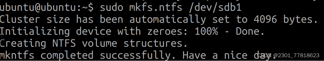 - 按两下tab可以显示,mkfs可以格式化的所有文件系统,常用ntfs(wins),ext3,ext4(ubuntu)