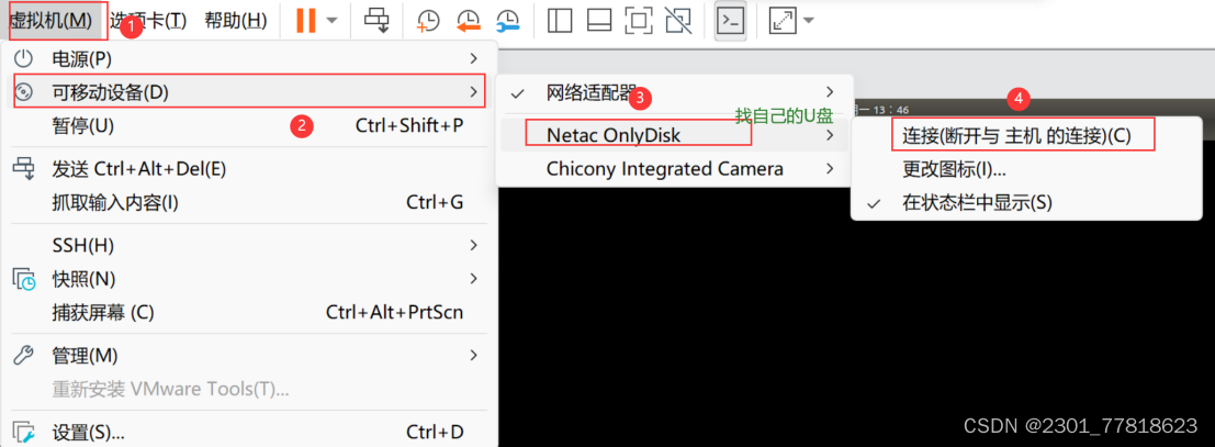 方法二:虚拟机---->可移动设备----->选择U盘----->链接