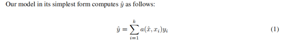 上述式子本质上描述了一个新类别的输出是支持集中标签的线性组合。其中注意力机制a是一个x×x的内核,上述式子类似一个内核密度估计器。依据一个距离度量和适当的常数,如果