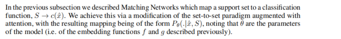 设置的整个支持集,我们可以使用余弦相似性去“attend”,“point”或者是简单的进行最邻近计算都是myopic,因为每一个元素x都是通过g(x)独立嵌入的。此外,通过函数f,S能够修改我们是如何嵌入test x的。