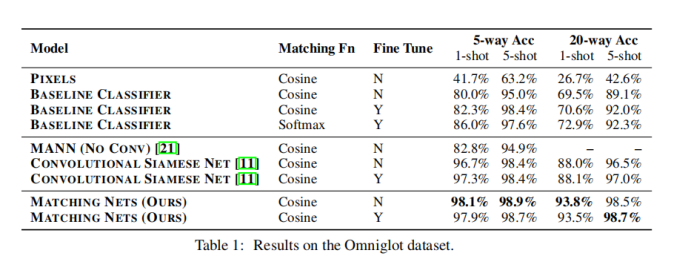 我们的所有实验都围绕着相同的基本任务:an N-way k-shot学习任务。每种方法都提供了一组K个标记的例子,这些例子来自每一个以前没有接受过训练的N个类。任务是将这些无关的无标签的样例分类到这N个类中。我们将多个备选模型(作为基线)与匹配网络进行了比较。![]()