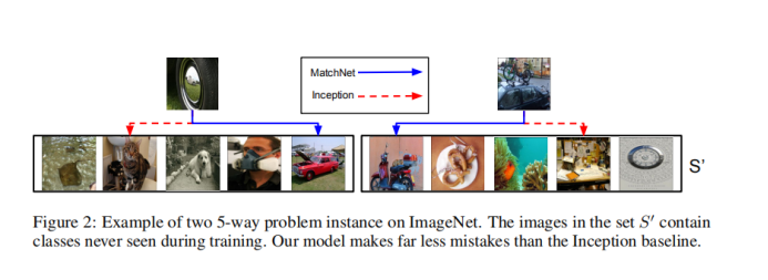 上训练时,将错误率减半。从所有的错误来看,“盗梦空间”有时似乎更喜欢图像,而不是其他图像(这些图像往往像第二列中的示例一样混乱,或者颜色更恒定)。另一方面,匹配网设法从支持集S’中出现的这些异常值中恢复。