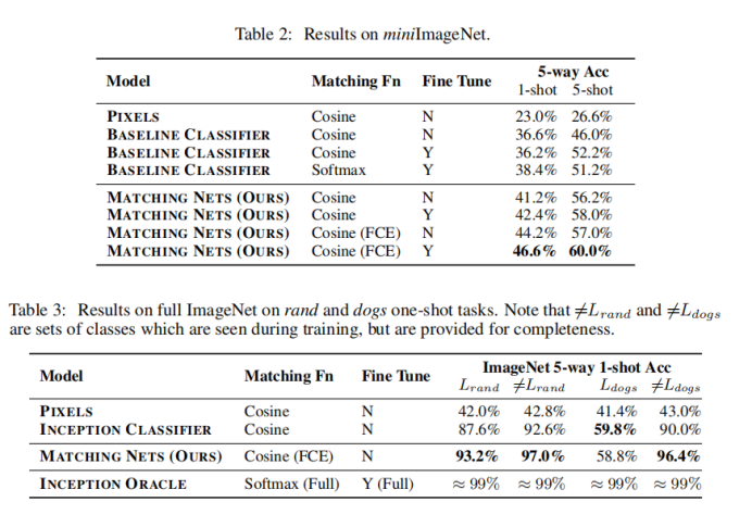 和Omniglot一样,匹配网络比基准网络表现的好。但是miniImageNet比Omniglot任务要难,它让我们去评估Full Contextual Embeddings的灵活度。不管有没有微调,FCE提高了匹配网络的表现。