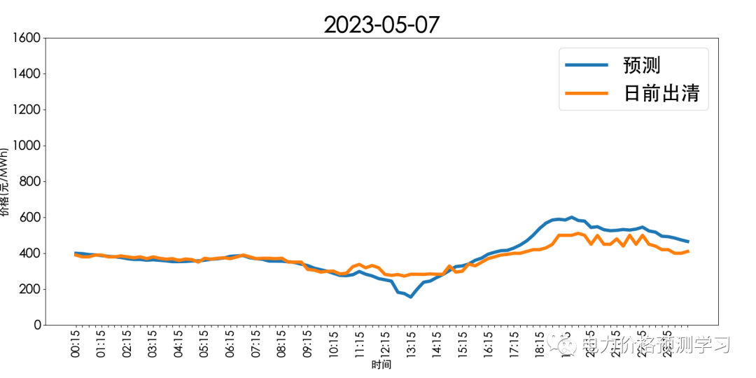 2023-05-07全天96个点平均预测准确率90.11%,平均绝对偏差为37.13元/MWh。
