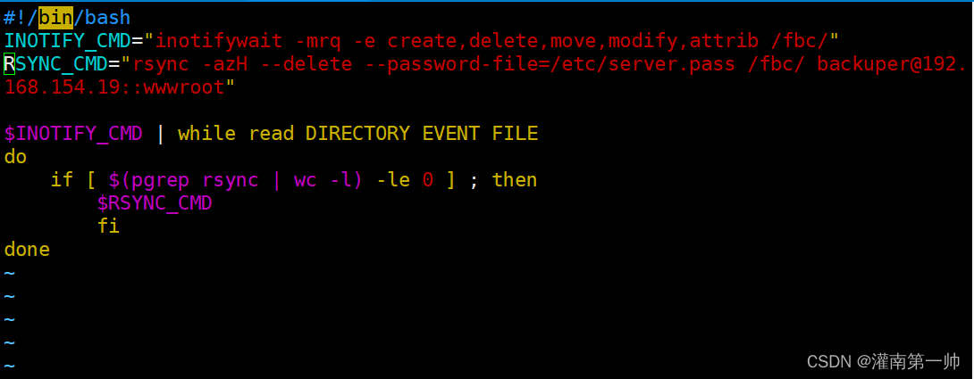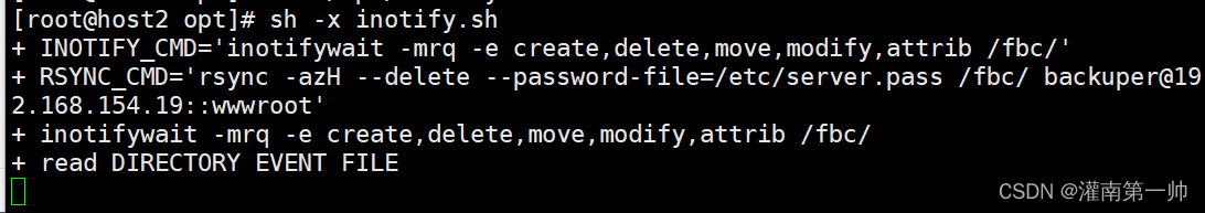 #RSYNC_CMD变量:使 xixi 用户,/etc/server.pass 密钥文件,将 /opt/xcf1 目录下的文件进行压缩,归档,保留硬链接文件同步至 192.168.154.19 的共享模块定义的目录 /var/www/html 下,并删除差异性内容,保持一致性$INOTIFY_CMD | while read DIRECTORY EVENT FILE #持续监控...