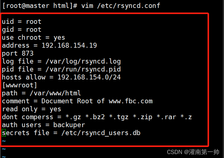 #rsync系统一般已默认安装,安装httpd是为了生成/var/www/html目录(后续会用到作为共享目录)vim /etc/rsyncd.conf