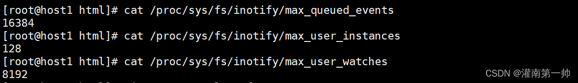 cat /proc/sys/fs/inotify/max_queued_events #监控事件队列