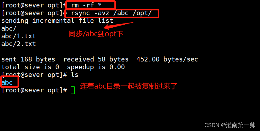 rsync -avz abc/ /opt/ :只会拷贝abc目录下面的文件,而不会拷贝abc这个目录rsync -avz /abc /opt/:会连着目录一起拷贝到/opt下