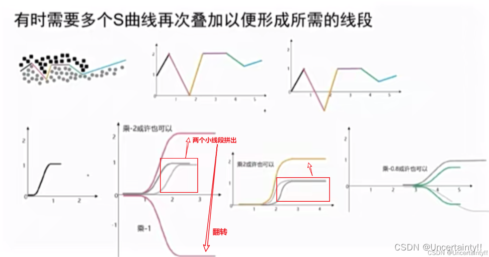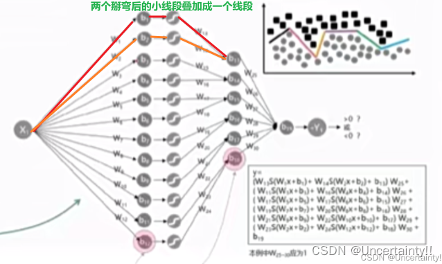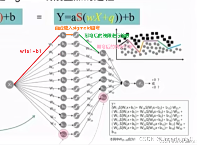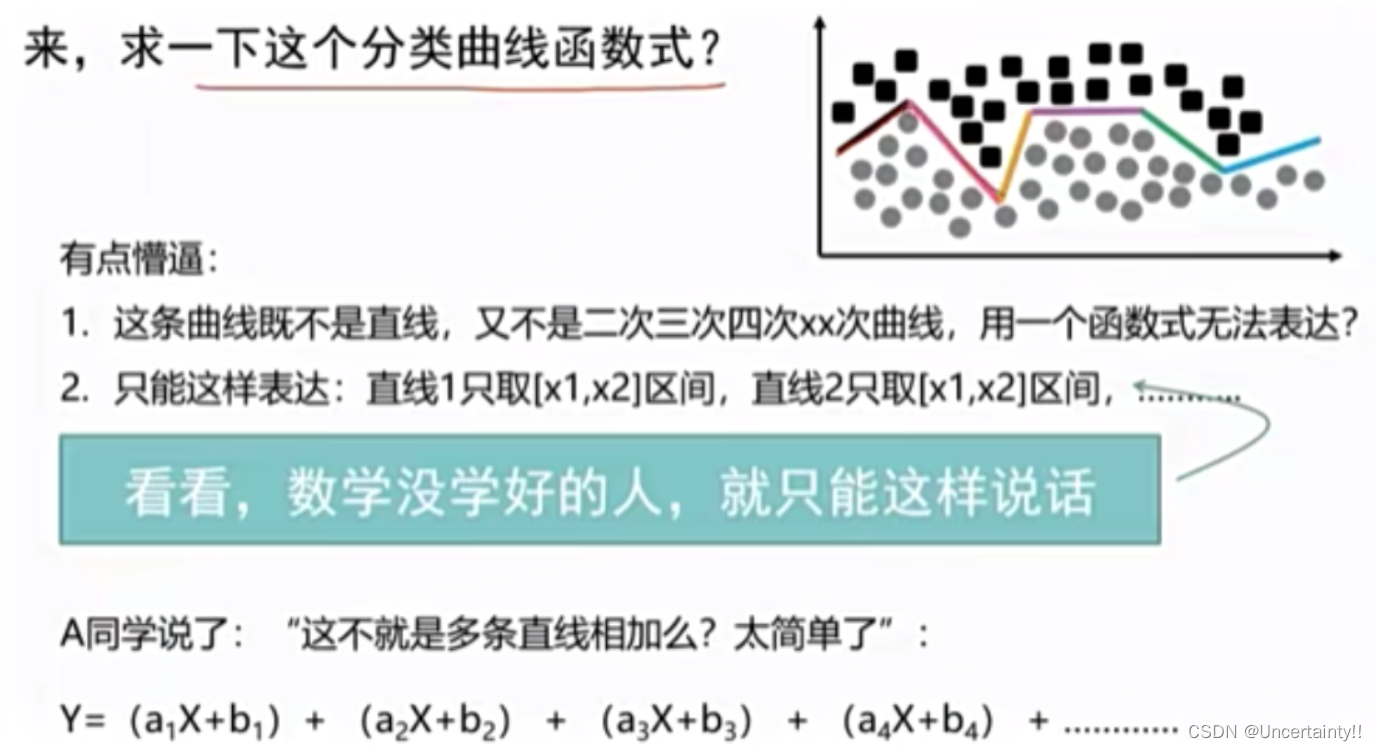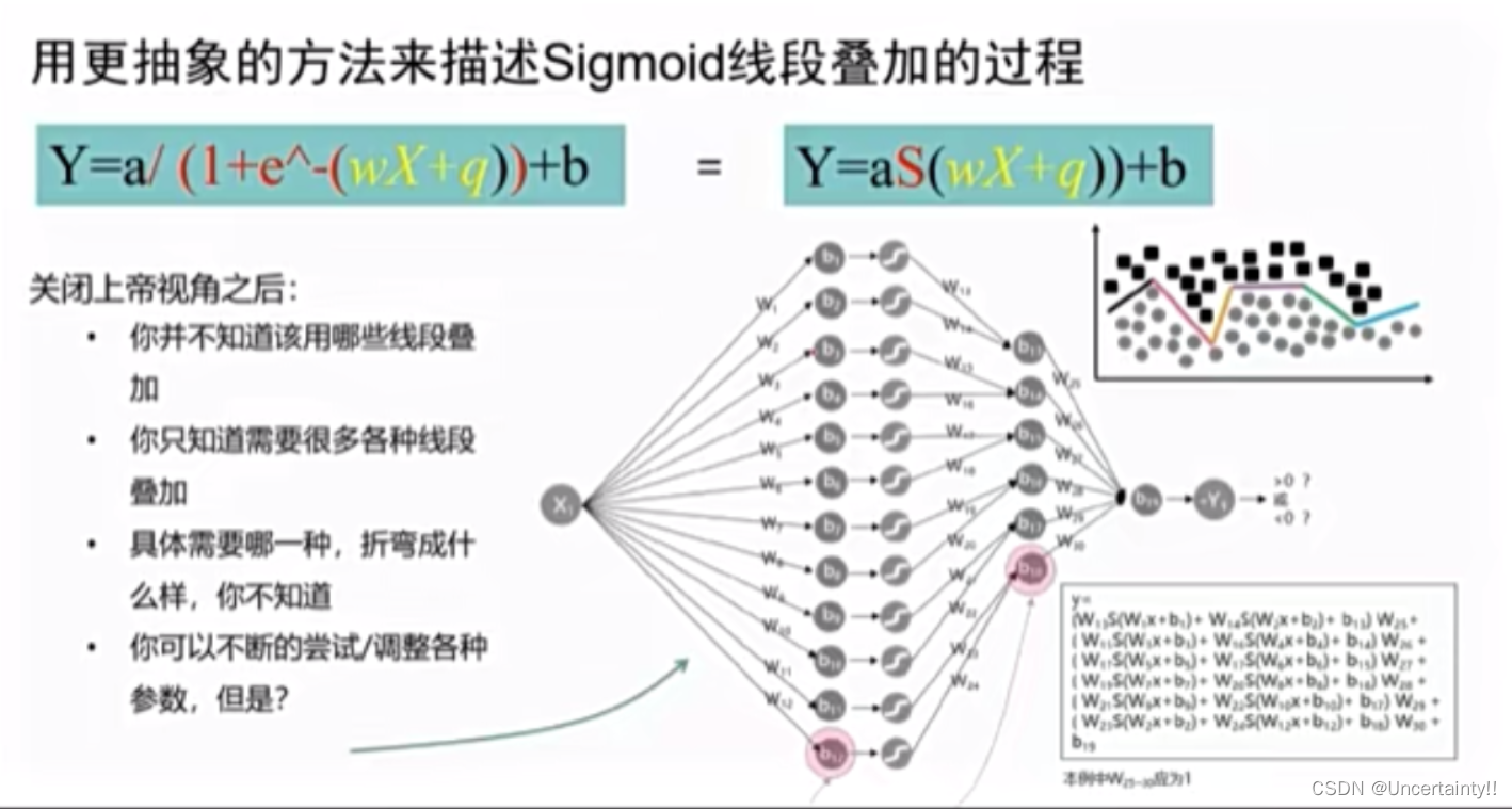 复杂分类->多个线段->每个线段是叠加而来的->sigmoid函数作为小线段的来源->不同的sigmoid可以叠加成任意形状的小线段,多个小线段拼接得到最终复杂分类的线段->这个过程用抽象的方法表达(神经网络)