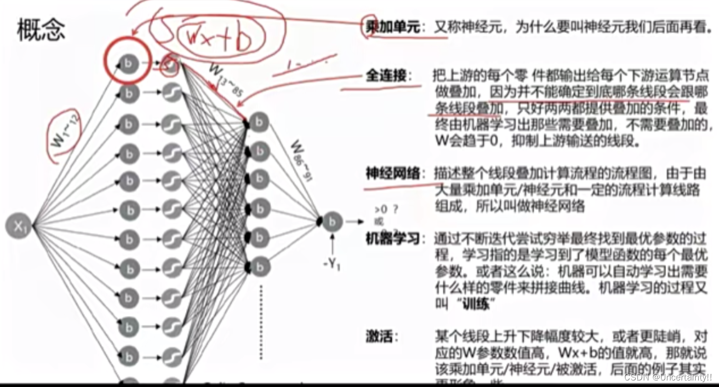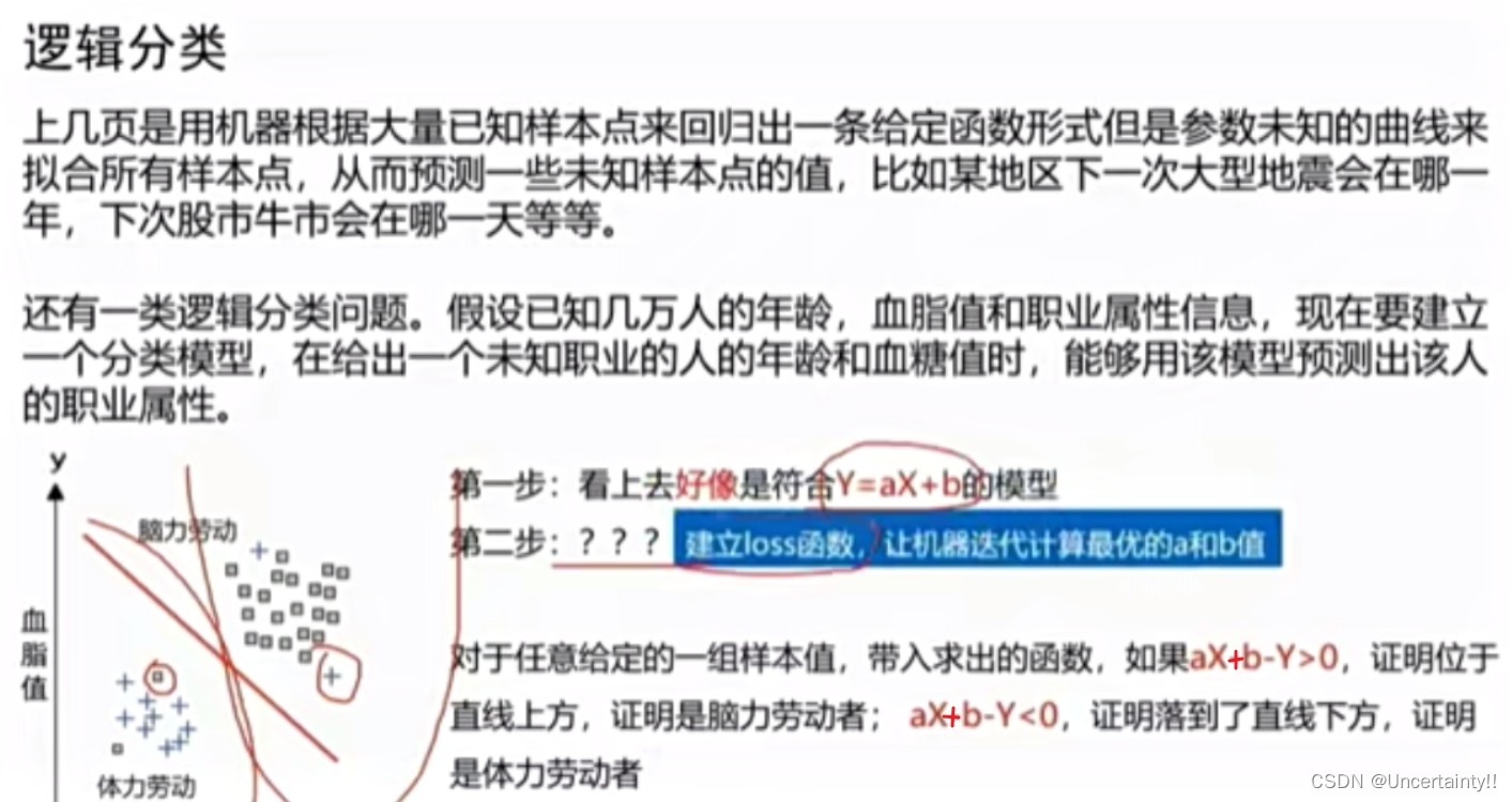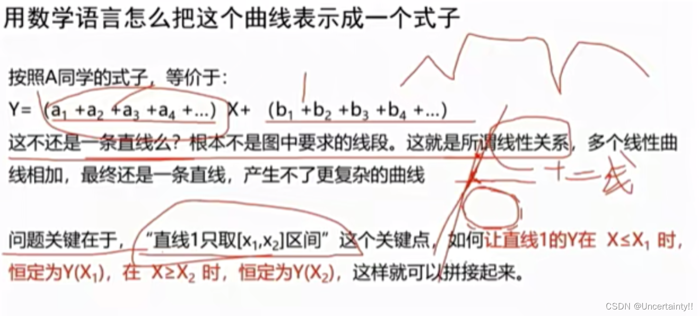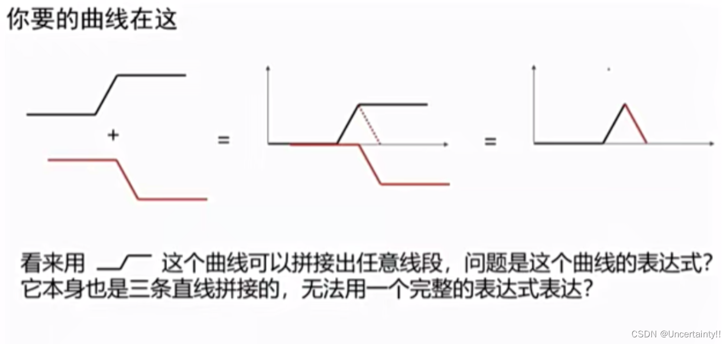 复杂分类->多个线段->每个线段是叠加而来的->sigmoid函数作为小线段的来源->不同的sigmoid可以叠加成任意形状的小线段,多个小线段拼接得到最终复杂分类的线段->这个过程用抽象的方法表达(神经网络)