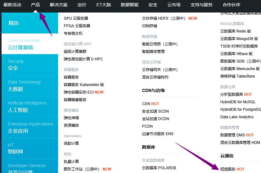 第二步:点击产品--->云计算基础--->云通讯--->短信服务