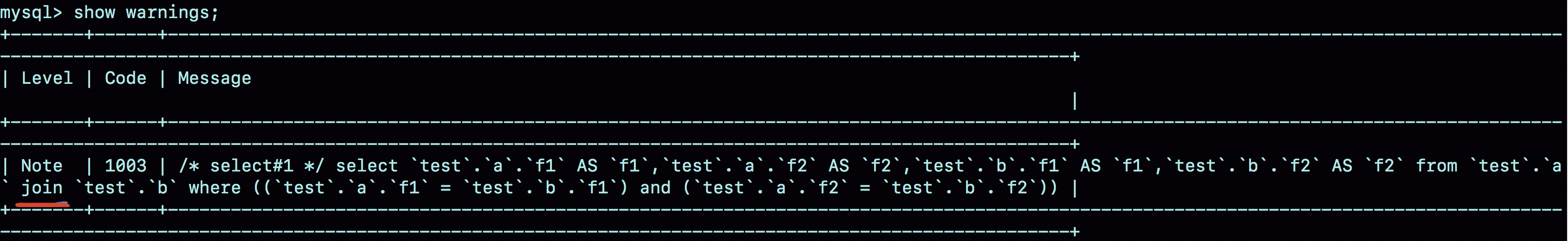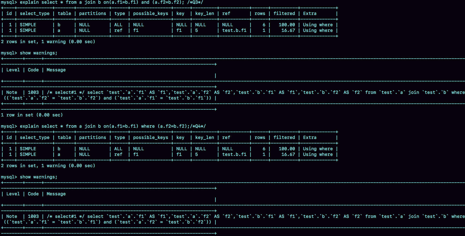 可以看到,这两条语句都被改写成:select * from a join b where (a.f1=b.f1) and (a.f2=b.f2);