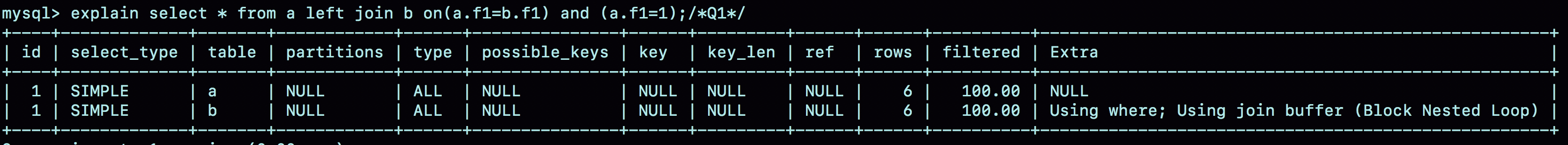 因此,优化器就把这条语句的left join改写成join,然后因为表a的f1上有索引,就把表b作为驱动表,这样就可以用上NLJ算法。在执行explain之后,在执行show warnings