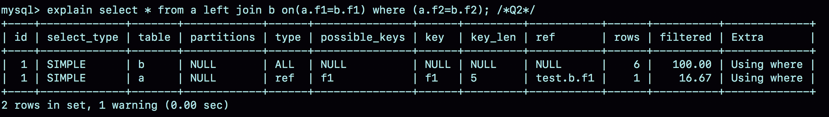 select * from a left join b on(a.f1=b.f1) where (a.f2=b.f2);/*Q2*/