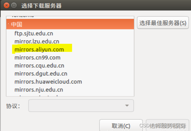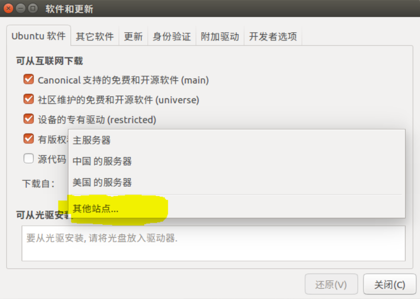 点击【软件和更新】---【ubuntu软件】---【下载自】---【其他站点】---【http://mirrors.aliyun.com/ubuntn】---【选择服务器】