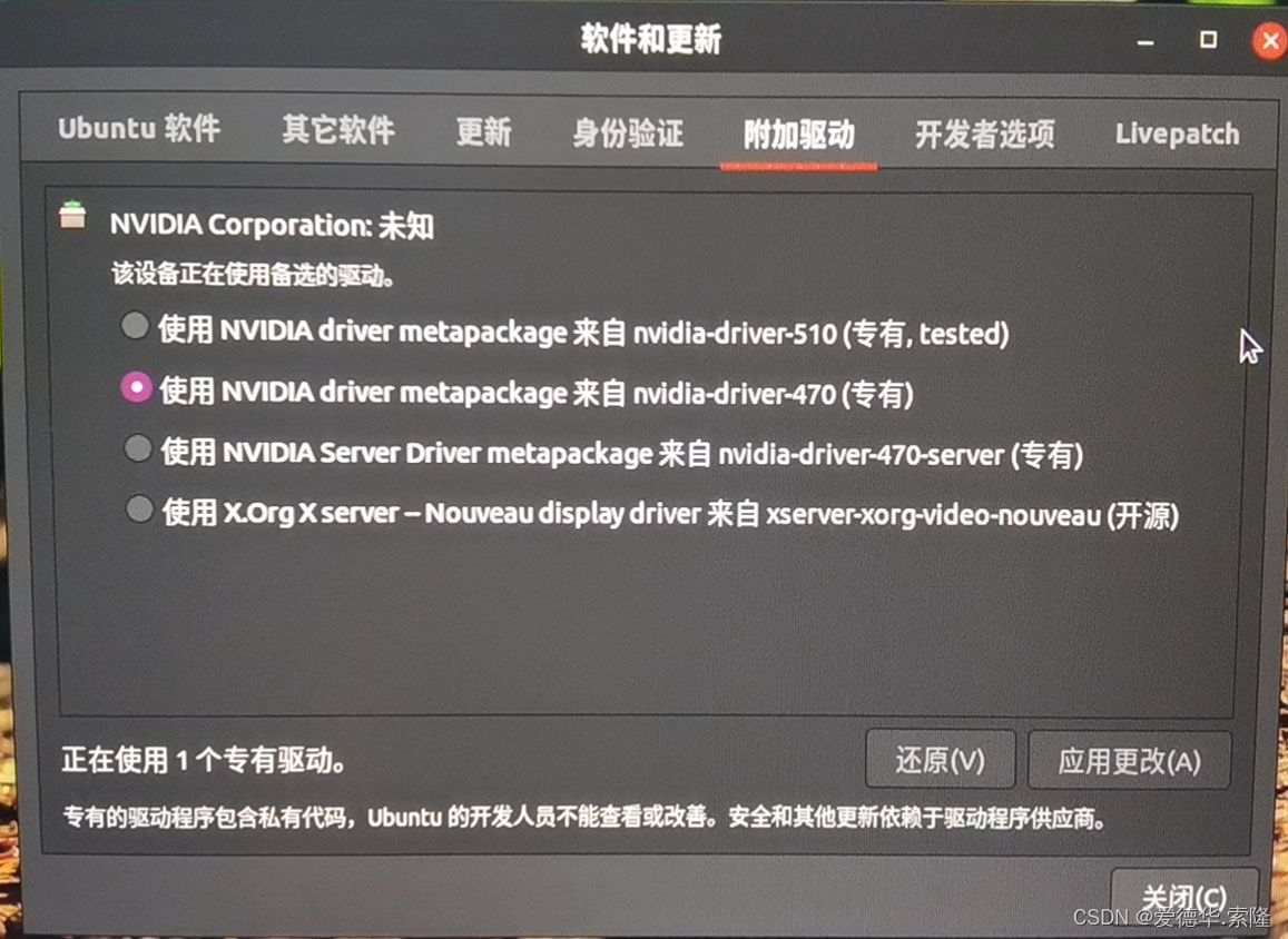 点击【附加驱动】---【470专有】 ---【应用更改】