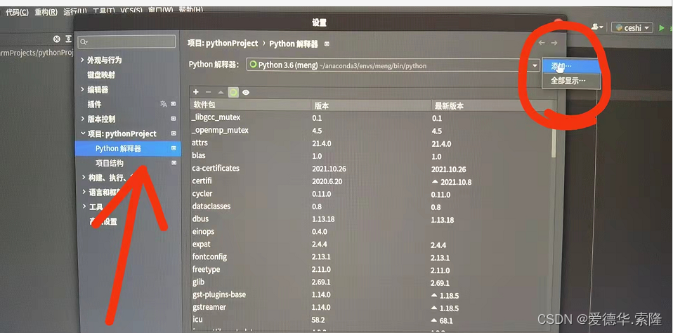 点击【文件】---【设置】---【Python解释器】---【添加】---【Conda环境】