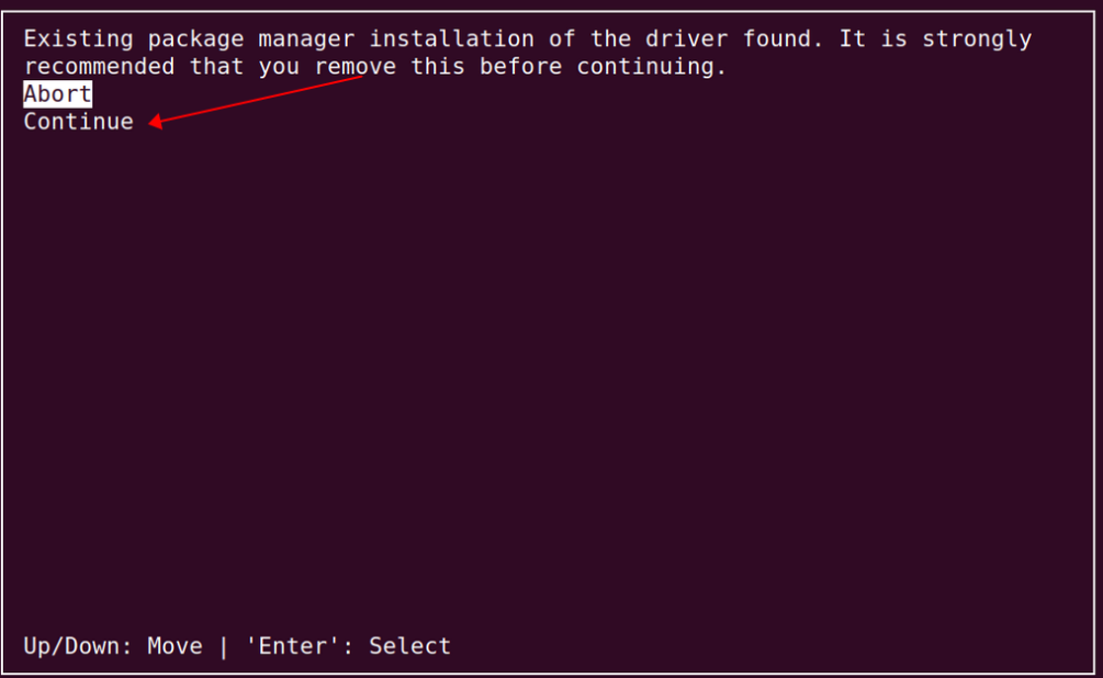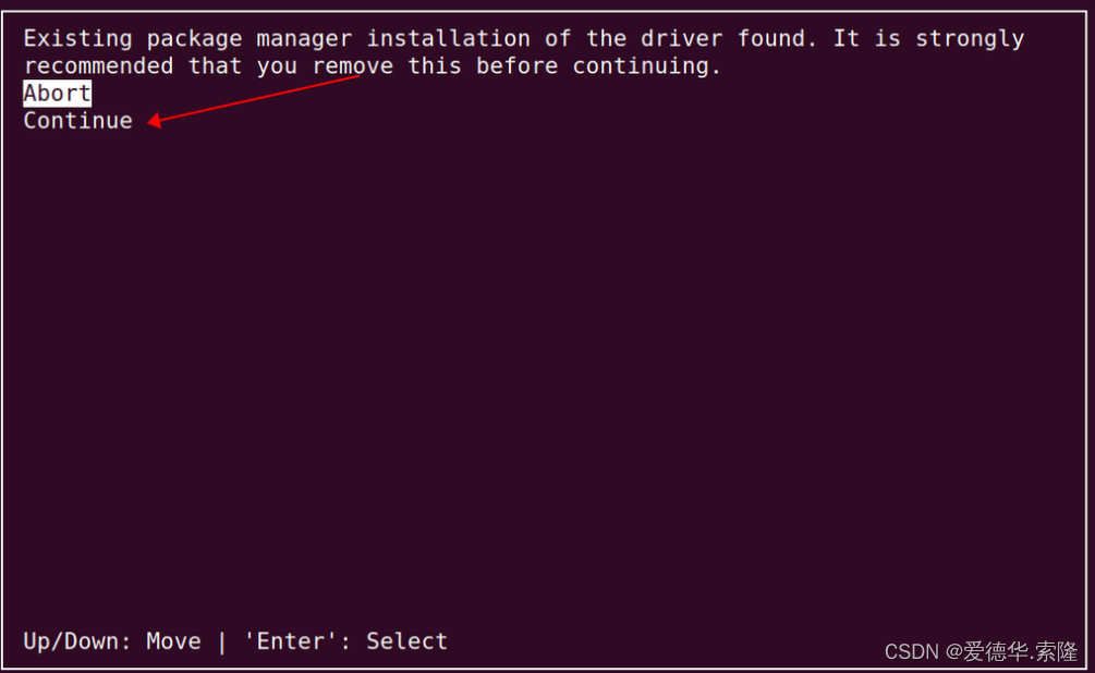 若已经安装了Nvidia驱动,会提醒移除,此时我们先continue,如下图