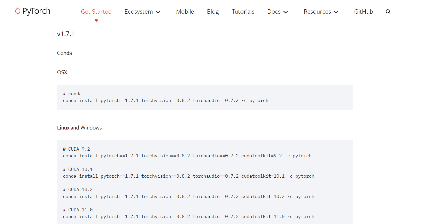 找到 1.7.1 版本的 linux pip 安装命令 选择 CUDA11.0 的命令
