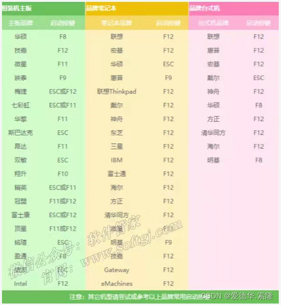 然后点击开机,从U盘启动,因为不同电脑主板,设置方法不同,提供以下快捷键(各主流机型快捷键如下图),
