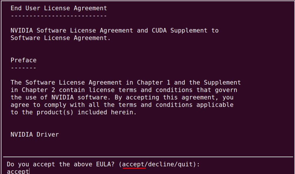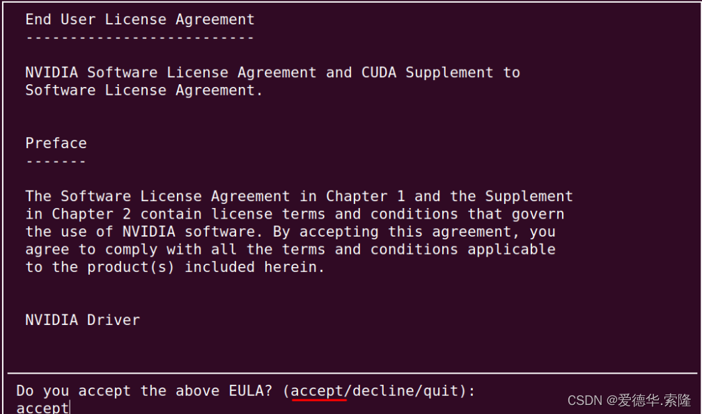 意思是许可信息还没显示完,一直按回车,直到最后许可信息显示完出现下面提示: