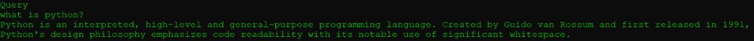 def google(query):query = query.replace(" ","+")try:url = f'https://www.google.com/search?q={query}&oq={query}&aqs=chrome..69i57j46j69i59j35i39j0j46j0l2.4948j0j7&sourceid=chrome&ie=UTF-8'res = requests.get(url,headers=headers)soup = BeautifulSoup(res.text,'html.parser')except:print("Make sure you have a internet connection")try:try:ans = soup.select('.RqBzHd')[0].getText().strip()except:try:title=soup.select('.AZCkJd')[0].getText().strip()try:ans=soup.select('.e24Kjd')[0].getText().strip()except:ans=""ans=f'{title}\n{ans}'except:try:ans=soup.select('.hgKElc')[0].getText().strip()except:ans=soup.select('.kno-rdesc span')[0].getText().strip()except:ans = "can't find on google"return ansresult = google(str(input("Query\n")))