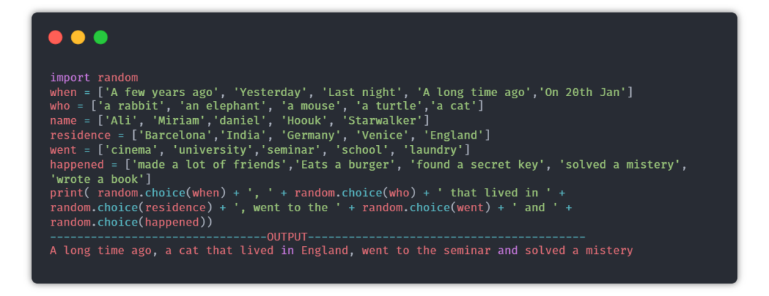 提示:random模块可以用来选择故事的随机部分,内容来自每个列表里。