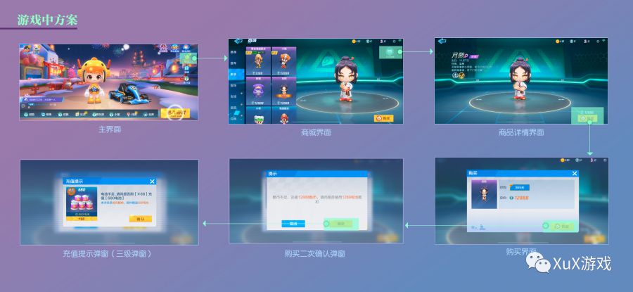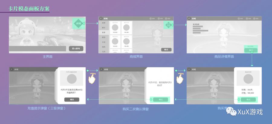 - 通过手势操作简化复杂堆叠层级,给单一选项减少玩家思考。从下面交互设计图可以看出,从商城界面、商品详情界面到购买界面、二次确认界面、充值提示界面所有的操作按钮都只有一个并且同一位置,让玩家在购买时更加流畅操作,最高效完成目标,获得心爱物品。