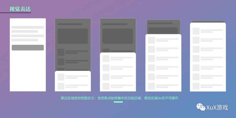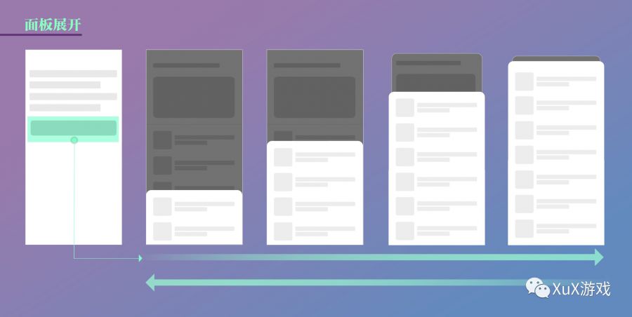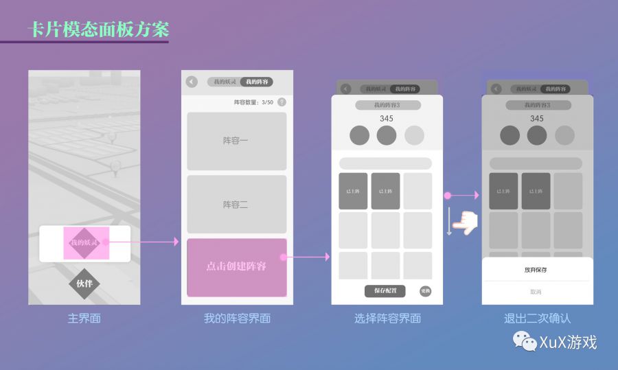 视觉表现主要分为界面美术设计和动效表现。游戏交互设计师主要负责视觉的跟进审核,想让视觉设计师达到想要的效果,交互设计效果图需要明确表现二者的层级关系并在美术需求文档中标注说明关系(理论了好一会偶尔实操下,不要走开,更有实操在后面哦~)。主要目标就是明确卡片模态面板与主窗口的关系,在展开模态面板时,一定要明确让玩家知道此过程不可操作,同时玩家回到主窗口时,也要通过美术表达和微动效融合明确表达现在视觉焦点和操作已回归主界面。