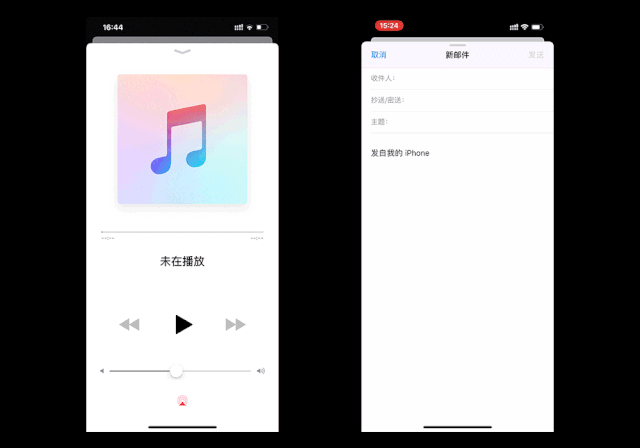 iOS13的邮件app用户进入后新建邮件,但是在写邮件同时想进行查看收件箱等操作,此时下滑回到主窗口,新建邮件的展开模态面板快捷方式现在在主窗口的界面底部,方便玩家多任务同时进行。iOS13的很多app用户分享主窗口操作时,点击分享按钮操作后出现半屏分模态面板,手势向上滑动会变为卡片模态面板。