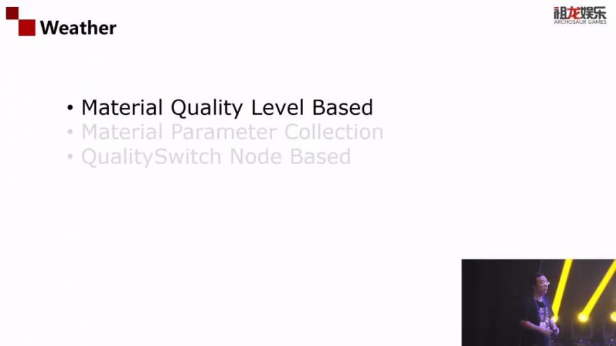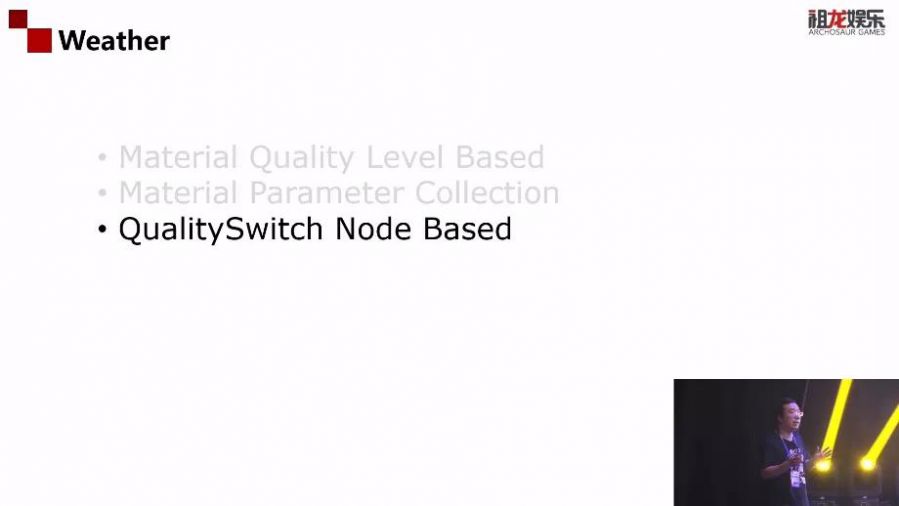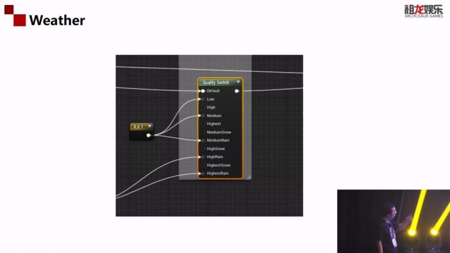 还有就是,我们在材质编辑器里面,我们可以通过Quality Switch这个节点来做一个不同的等级效果的LOD,我现在细化一下。我们决定用质量等级来做天气系统之后呢,我们就开始着手加,因为它原来不够,只有低中高最高。我们加了好几种,有雨和雪,雨和雪最终都加了最低、中、高、最高,很多很多。后来我们觉得这样不行,我们砍掉了很多,只留下最基础的一些。