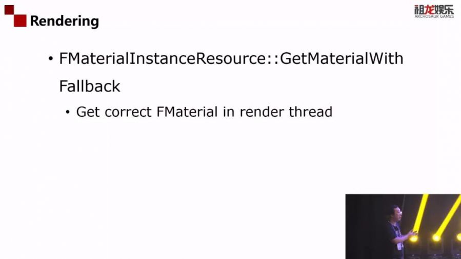 每一个所使用的质量等级,它其实是保存在这个UMaterialInstanceDynamic类上面的。在渲染的时候,它是怎么使用的呢?在主线程你创建了Dynamic的Material Instance,获取了对应的ShaderMap交给了渲染线程,来切换渲染线程使用的ShaderMap。