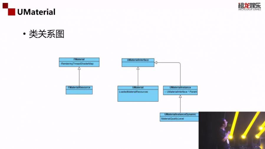 这就是一个关于材质系统,最核心的八个类。关系图我只是列了上面这四个,他们是这样的一个关系:UMaterialInterface是最上面的父类,派生出来UMaterial和UMaterial Instance。UMaterial和UMaterialInstance是兄弟关系。