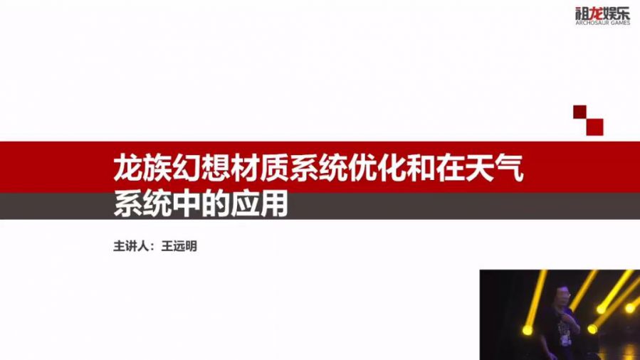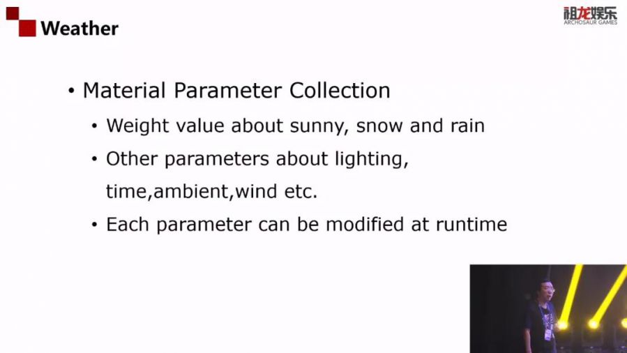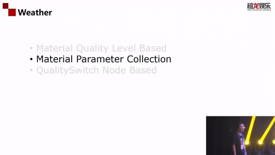 所以在这里也借助这个机会,感谢UE的同学给予祖龙娱乐大力的支持,谢谢。今天我的主题分两个方面,第一方面是材质系统优化,第二个方面是天气系统。我今天讲的并不是说如何使用它来制作逼真的天气效果,而是采用一个什么样的方式、利用UE引擎的哪些特性来制作天气系统。