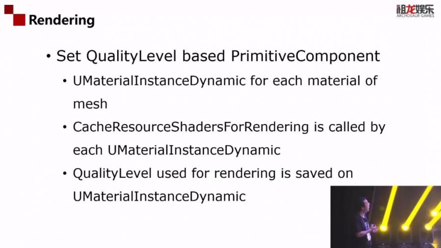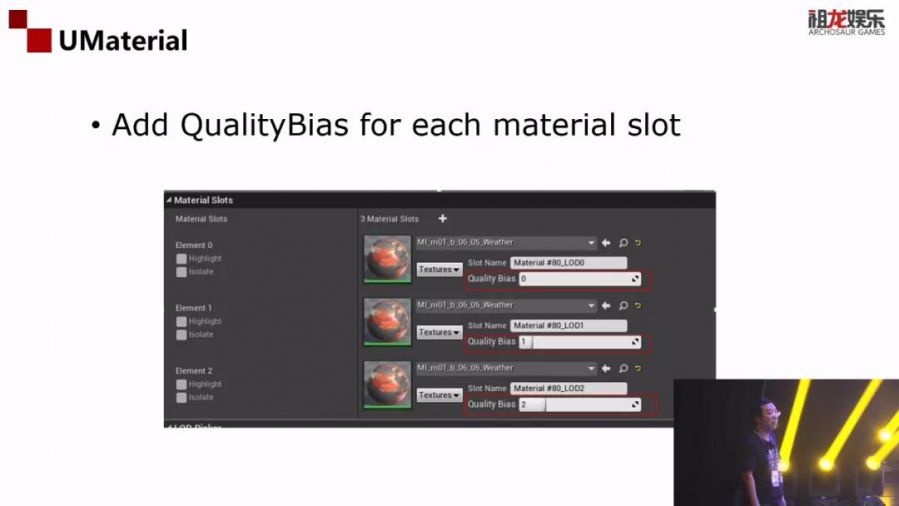 然后在一些低端机器上,我们会砍掉一些不必要的质量等级。比如说因为质量等级的加载是运行期做的,在UMaterial的函数里面去做的,发现是比较差的机器的话,就只保留一种Low或者是Medium。要看实际的效果。可以写一个很大的配置表,这个机器是用低还是用高,在运行期决定到底是扔掉哪些、保留哪些。