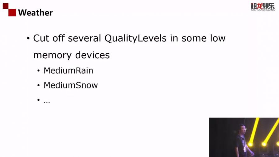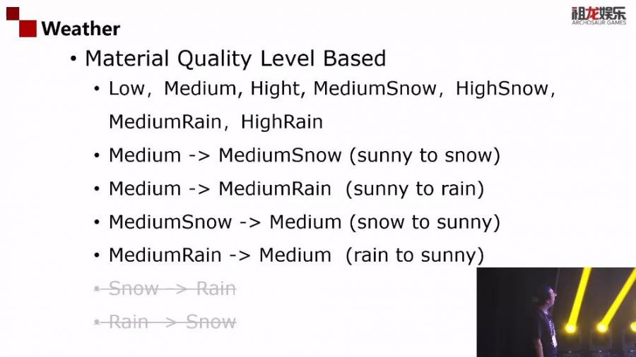 所以我们在最差的机器上没有天气的变化,因为我们只有low,没有low rain、low snow。在中等的机器上和最高级机器上,我们会有分别对应的雪和雨。比如说我们雪的变化,从medium的质量等级,切换到medium snow,然后晴天到雪、从晴天到雨还有反向的切换。