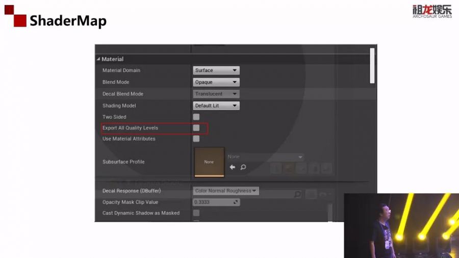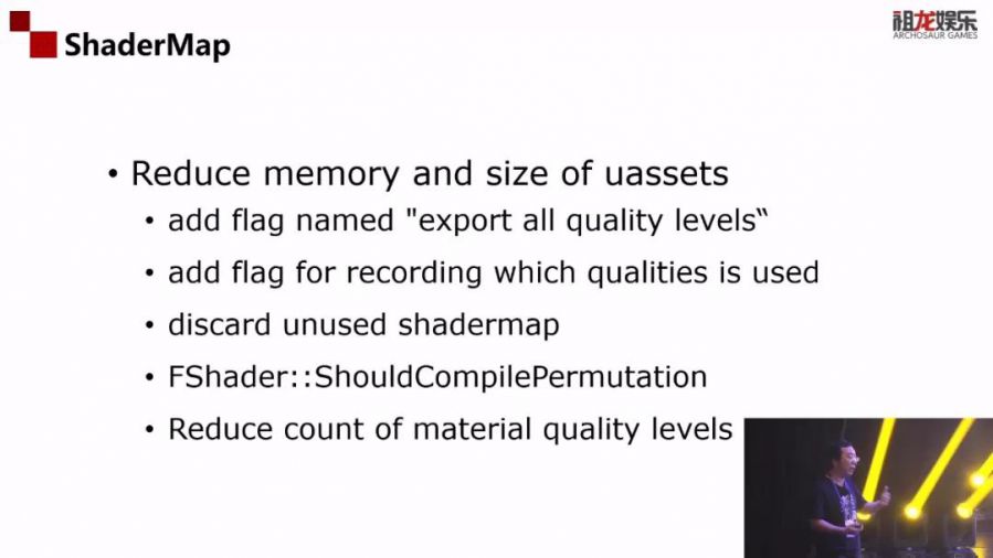 我们在Shader Map方面也做了一些优化,Shader Map刚才我讲他最直观的就是对应着系统设置里面的高中低那么几档,可能游戏做了很多档,不光是高中低,还有最高、最低。每一个这样的等级,都在UMaterial这个材质文件里都会对应着一个Shader Map。不管是存储资源,还是运行期的开销,还是内存显存,都是要占资源的。